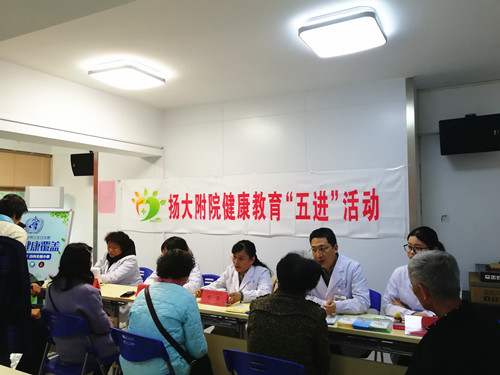 在新盛社区,中医科主任刘茜、眼科副主任医师朱晓宇为社区居民进行中医养生和眼健康知识的讲座。讲座后,中医科、眼科、药剂科、输血科、防保处的医护人员为居民提供了义诊咨询服务,并为他们免费测血型、血压,发放健康宣教材料。
