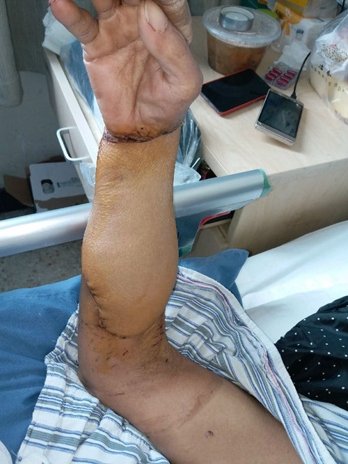 患者张某,男性,69岁。因工作时机器绞伤导致右侧前臂流血不止,剧痛无比,活动受限。家人立即将其送来我院就诊。送来时,患者右前臂已畸形,大面积皮肤撕脱,肌肉、肌腱撕裂、外露,尺桡骨骨折断端外露,手指还有血运,单已经不能活动,外伤创面有大量金属颗粒残留,污染严重。经过X光检查,医生诊断其右尺桡骨粉碎性骨折、肘关节脱位。