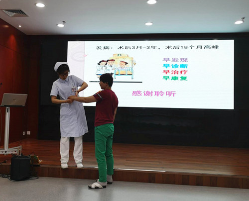此次讲座以“战胜乳腺癌,把握美丽人生”为主题,旨在为乳腺癌患友普及乳腺癌的治疗方法及术后淋巴水肿的综合治疗。甲乳外科副主任诸林海从手术治疗、放射治疗、化学治疗、内分泌治疗及靶向治疗等5个方面讲解了乳腺癌的治疗方法。他建议患友选择适合自己的治疗方式,改善预后,并向他们普及了提高乳腺癌治愈率及生活质量的最新治疗方式——双靶向治疗;西9病区护师齐秀丽为患友讲解了乳腺癌术后淋巴水肿的综合消肿治疗,并现场演示单手引流法,指导患友出院后的自行按摩。讲座结束后,患友针对自身情况踊跃提问,诸林海均做了详尽的解答。