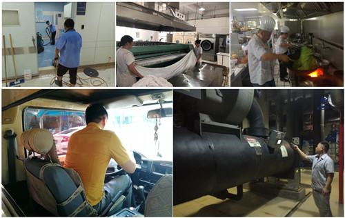 维修师傅上到天花楼顶,下到管道机房,大到设备抢修,小到螺丝螺帽,全力出击,与高温作战,保障医院水电安全;班组运行人员穿梭在空调机房,不惧设备周围的高温和高噪声,落实全天候巡检,以保证设备稳定运行,给全院各区域送去清凉;洗衣房的工作人员立足各自点位,相互协作,萦绕在高温的环境中,任凭汗水浸透他们的衣背,也不影响工作的进度;食堂师傅挺立在操作间里,火光闪耀,油炸声、爆炒声在耳边,守护着舌尖上的安全;外环保洁员、绿化养护员工顶着烈日,坚持按时完成日常保洁、绿化工作,保障了院内的整洁和美观;负责物资转运的驾驶员不惧酷热,车内温度高达54.7度,他们仍然握紧方向盘,确保行车安全与物资的准时运达;保安师傅分布在医院各个角落,疏导来往车辆,汗水湿透全身、滑落脸庞,他们依旧全神贯注,不停地变换手势、吹响哨子,只为确保医院交通的顺畅。