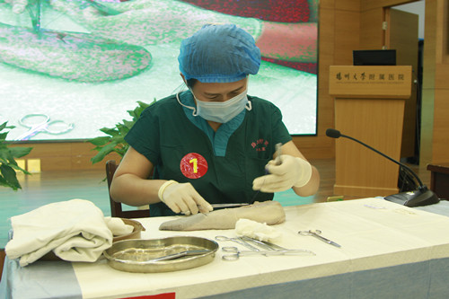 比赛分为理论考试和操作考核两部分。在理论考试中,参赛选手需在规定时间内完成了理论知识考核;在操作考核中,参赛选手根据不同案例进行评估、准备、缝合、沟通,认真观察伤口,仔细逐层缝合。评委们根据每一位选手缝合伤口的针距、宽度、深度、切口对合、以及缝线打结的松紧度、缝合速度、器械的正确使用等情况,严格按照评分细则公正打分。