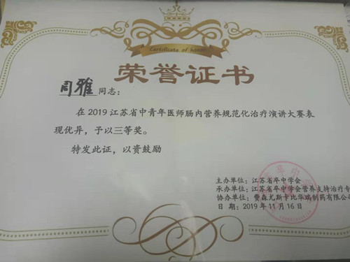 11月16日,江苏省中青年医师肠内营养规范化治疗病例比赛总决赛在苏州举行。我院临床营养科营养医师周雅参赛,经过角逐,获得三等奖的好成绩。