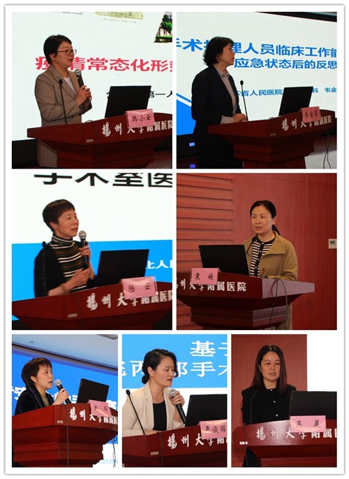 本次培训班邀请省内知名手术室护理专家围绕手术室应急状态下的各种管理进行现场授课。江苏省护理学会手术室护理专委会主任委员、常州市第一人民医院护理部主任韩小云作“疫情常态化形势下暴力伤医应对”讲座;江苏省护理管理专委会副主任委员、江苏省人民医院麻醉手术科护士长韦金翠作“手术护理人员临床工作能力提升应急状态后的反思”讲座;原江苏省护理学会手术室专委会副主任委员陆云作“手术室医院感染监测”讲座。袁媛,我院感染管理处处长赵烨、东区手术室护士长严俊丽、西区手术室总带教吴晨分别作“手术室护理专科建设的实践与思考”“基于患者安全的手术室感染控制”“一院两部手术室间联动应急策略”“手术室应急处置情景演示”讲座。会上,以情景剧形式演绎腔镜手术中出血转开放的案例。