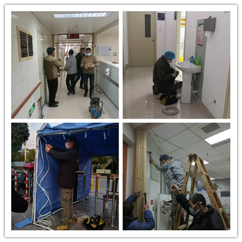 维修服务中心管理人员和班组长带头,水电、瓦、木多工种通力协作,他们日夜赶工爬梯子、钻管道、布电线、装设备等,以最快的速度为隔离病房的启用、发热门诊的改建、中心实验室区域改造和科室搬迁等工作落实好后勤维修保障。根据工作需要,共计安装了专用视频可视对讲系统5个,安装了电话10部,加装隔断8处184.5平方米,确保了区域供水、供电、通风、通讯等后勤设施保障。