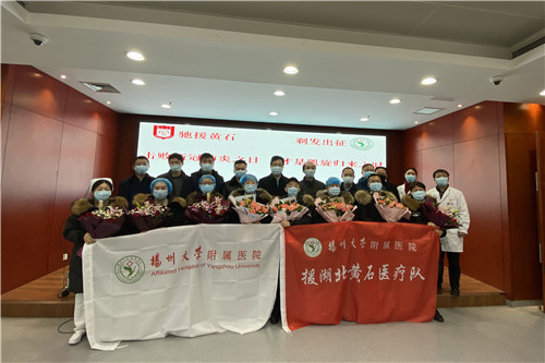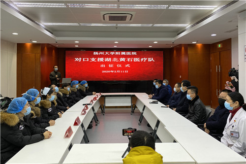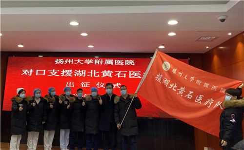 据了解,我院8名队员与扬州市其他16名医护人员组成扬州市援黄石医疗支援队,从扬州出发,奔赴湖北省黄石市抗“疫”战场。扬州市卫健委为24名队员举行出征仪式,扬州市委书记夏心旻为队员们送行,并代表市委市政府向他们表示崇高的敬意。市委常委、秘书长韩骅,副市长余珽,扬州大学党委常委、副校长费坚参加活动。市卫健委党委书记、主任赵国祥主持市出征仪式。