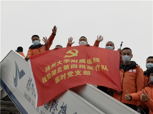 2月13日下午4点50分,江苏省第七批援湖北扬州医疗队的164名医务人员从扬州泰州国际机场出发,急赴武汉。扬州市委书记夏心旻,市长张宝娟,市政协主席陈扬,市委常委、市委秘书长韩骅等四套班子领导在机场为大家壮行。在这164名队员中,有30名医护人员来自扬州大学附属医院。