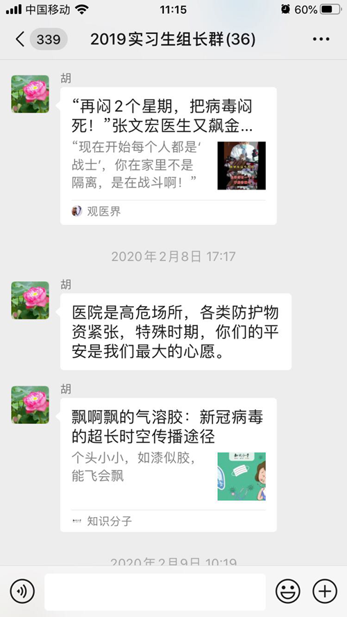 2月上旬,我院已经着手安排对本科驻点生、实习生、研究生、规培生的在线学习任务。副院长王正兵对具体工作做了部署。王正兵及教育处负责人分别在各类学生管理群和导师群中,对疫情防控期间的学习管理作出具体指导。同时组织规培导师和研究生导师通过微信、QQ等多种方式进一步指导学生查阅文献、论文写作、就业指导等,为学生答疑解惑,并进行心理疏导。研究生导师焦云根在线指导学生论文修改,引导研究生合理安排学习和研究任务,并及时予以答疑和疏导。