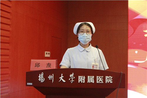 援鄂护士代表、医院第三届护理操作技能竞赛决赛选手邱焘在活动现场讲话。“医院一年一度的护理操作技能竞赛是我们进步的阶梯,作为操作选手代表,通过参赛,我的操作技能得到了一定的提升,同时也让我更加自信地面对现实与未来。在新冠肺炎的隔离病房里,当穿着厚重的防护服、戴着三层手套、面临各种精细操作时,我们可以勇敢地站出来说‘我可以’;当面对气管插管、呼吸机辅助通气的患者时,我们也可以第一个站出来说‘我能行’;当面对三期压疮、生活不能自理的患者时,我们可以大声地站出来说‘让我来’;当面对PICC置管维护时,我们更是自豪地说‘我擅长’!正是因为扬大附院培养了我们良好的专业技能,才让我们面对陌生的新冠肺炎病毒时有了足够的勇气与担当,衷心祝愿各位护理同仁节日快乐!”