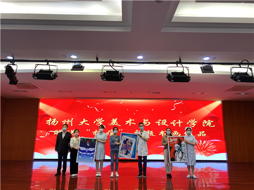 由90后援鄂护士王新宇,拍摄的原创视频“最亮的星星,最真的笑容,最美的你”在活动现场播放。饱含深情的朗读,平凡感人的画面,让在场的观众泪目。扬大附院英雄们的逆行壮举牵动着扬州大学全校师生的心。美术与设计学院的学生们纷纷拿起手中的画笔,为白衣天使创作出一幅幅战“疫”海报。现场,美术与设计学院领导马雷、李玫、周峰和创作者代表向援鄂队员代表冷俊岭、韦青、邱焘现场捐赠书画作品。马雷及美术与设计学院创作者代表讲话。他们充分赞扬了白衣天使不畏艰险、逆行出征、心系天下、悲天悯人的医者仁心,赞扬他们以过硬的政治品格、专业技术和工作作风,出色地完成了党和人民交给的任务,将扬大人好品质、好作风、好形象留在了荆楚大地。