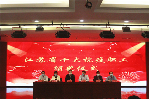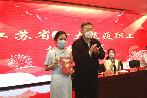 5月12日下午,扬州大学附属医院在西区医院第一学术报告厅举行江苏省十佳抗疫职工颁奖仪式。省总工会副主席马永青,扬州大学党委常委、副校长刘巧泉,省总工会宣网部部长张姿,市总工会党组书记、副主席李春国、副主席朱明,市教科文卫工会主任钱永羊等参加仪式。扬大附院党委书记王炜主持仪式。张姿在活动中宣读表彰决定。马永青为我院重症医学科护师、“江苏省十佳抗疫职工”李娟娟颁发江苏省五一劳动奖章。
