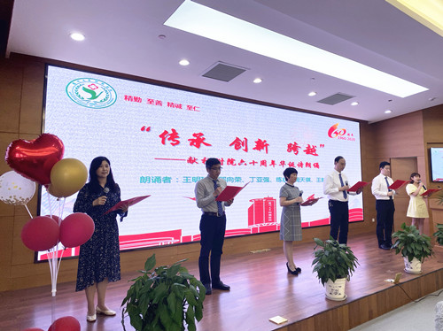 原耳鼻咽喉科主任练状、原人事处处长丁亚强,援鄂英雄、呼吸与危重症医学科邵向荣医生、退管办主任王明珠以及医院青年员工周天祺、王新宇共同朗诵诗歌“传承 创新 跨越——献礼附院六十华诞”。