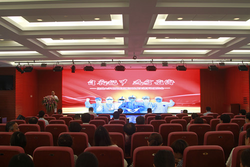 5月29日下午3:00,扬州大学附属医院在西区医院第一学术报告厅举行“白衣执甲 逆行无悔”援鄂抗疫先进事迹报告会。在扬院领导,各级行政职能部门正副主任,各级临床医技科室正副主任、诊疗组长,各单元护士长;各党总支书记(副书记);援鄂医疗队员;各党总支委员,党支部书记、委员,党小组长;工会委员会、女工委员会、经审委员会委员,工会小组长;离退休职工代表;团委(支部)书记、委员,团小组长;医院各级人大代表、政协委员;民主党派代表等共计300余人参加会议。院党委副书记、副院长单清主持会议。