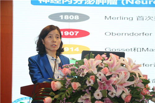 汤琪云致辞。汤琪云介绍了神经内分泌肿瘤疾病近些年的发病情况以及江苏省神经内分泌肿瘤诊治中心创建的背景、过程、取得的成绩、产生的影响等。她相信,江苏省神经内分泌肿瘤诊治中心扬州分中心的挂牌,能够让扬州大学附属医院在神经内分泌肿瘤专病上形成较为显著的优势,将其先进诊疗特色辐射周边地区,为今后工作的开展打开新局面,推动神经内分泌肿瘤这一专病学科建设的发展,更好地为神经内分泌肿瘤患者的健康保驾护航。