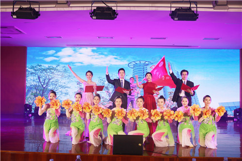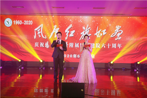 演出由周天祺、许思瑶主持。演出在开场舞蹈《我的祖国》中拉开序幕;一段大气磅礴的音诗画《风展红旗如画》回顾了扬大附院60年来的历史足迹,忆往昔、看今朝,赢得在场观众的阵阵掌声;音乐快板《说说我们的老前辈》,展现了扬大附院儿科这张王牌以儿科老专家周大博为榜样,与时俱进,承前启后,继往开来,永续发展的进取精神;在“书记访谈”中,院党委书记王炜对女承父业的周维克主任、附院CT之父吴克强主任、病理科岗位工龄之最的李家驭主任等3位医院老前辈代表,进行了访谈;情景短剧《拓荒者》再现了西区医院正式开业运行时的趣闻轶事,引得观众笑声阵阵;配乐演讲《知音》,再现了医院在21世纪之初,引进各类高端人才,提升了全院综合素质和核心竞争力,向冲刺三甲标准大大迈进了一步的“十大博士”行动;送医下乡,为农民朋友分忧解难,一直是扬大附院60年从未间断的义务和责任。消化内科近年来同乡镇卫生院结成医联体,开展给村民免费做胃镜检查等巡回医疗活动。民歌表演唱《春风春雨润农家》,由衷地抒发了广大农民的拥戴之情;60年来,医院在壮大自身的同时,积极响应国家号召,多次派出优秀医务工作者援外、援疆、援陕。援疆工作已进行了18年,共派出12名医生,跋涉4000多公里。男女声二重唱《花儿为什么这样红》甜醉所有参加过援外、援疆、援陕志愿者的心,给我们带来了天山雪莲似的圣洁青春;情景短剧《当未来照亮现实》再现了医院融入扬大,开启了医疗、教学、科研三结合、大发展的新征程的过程。科技之光照亮现实,也照亮未来,当我们眺望魔幻般的明天时,越加坚定攀登医学科学高峰的信心。未来并不遥远,道路就在脚下;舞蹈《江海之恋》将扬州大学附属医院通过优势互补,相激相荡,资源整合的过程完美呈现。我们每个人都是这江海里的一朵浪花,每颗心都是这浪花里的一簇精灵;武汉封城,湖北告急,2020的早春如此令人揪心!像众多省份紧急派出医疗救护队星夜驰援一样,扬大附院先后四批志愿者组成援鄂抗疫医疗队,加入同新冠肺炎争分夺秒、捍卫生命的惊险战斗!抒情小品《呼唤》道出了全体抗疫医疗队员们的真实心声;扬州老乡、著名军旅青年歌唱家汤非,倾情演唱歌曲《我把健康托付你》《感动》,祝福扬大附院60华诞,并向我院抗疫勇士们表达真挚的慰问和敬意;演出在舞蹈《春之声》中落下帷幕。