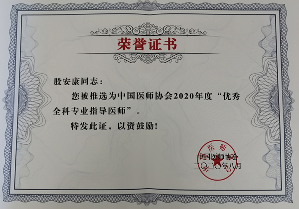 日前,由中国医师协会开展的2020年度“优秀全科专业住院医师规范化培训基地”“优秀全科专业指导医师”和“优秀全科医生”推选活动结果揭晓,我院全科医学科副主任、主任医师殷安康通过层层筛选,荣获2020年度“优秀全科专业指导医师”称号,成为江苏省唯一获奖者。