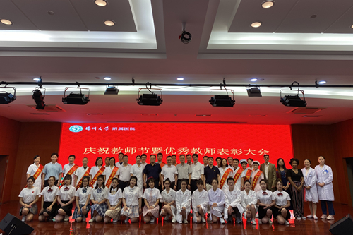 为庆祝第36个教师节,表彰近年来在教育教学工作中涌现出的优秀教师,9月8日下午4:00,扬州大学附属医院在西区医院第一学术报告厅举行庆祝教师节暨优秀教师表彰大会。院领导殷旭东、张文捷、蔡拥军、刘艳秋、王正兵、龚开政、丁岩冰,院16个临床教研室主任、教学秘书、教学干事、本科生导师,院22个住培基地主任、教学主任、教学秘书、住培生导师,院硕士生、博士生导师,院教学名师培养对象,2020年院临床技能培训教官,所有受表彰人员,学生、规培生代表等共计200余人参加会议。