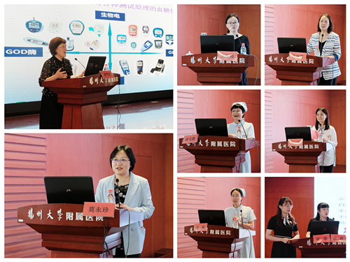 学习班上,南京医科大学附属老年医院护理部主任莫永珍、大内科兼糖尿病中心护士长巫海娣分别作“糖尿病专科护理发展趋势与专科护士的作用”“住院患者血糖监测规范”讲座;扬州大学附属医院护理部副主任陈玉瑛、俞萍、内分泌科副主任医师冯文凯分别作“预防针刺伤专家共识解读”“糖尿病足伤口管理新理念”“糖尿病胰岛素治疗策略”讲座;江苏省糖尿病护理专业委员会委员、扬州大学附属医院东区门急诊科科护士长沙仕贤作“妊娠糖尿病的管理”讲座;江苏省糖尿病专科护士、内分泌科护士长房丽作临床个案分享;苏北人民医院护理总监谢雯俊作“医院专用血糖管理平台的临床价值”讲座。江苏省糖尿病专科护士、扬州大学附属医院内分泌科主管护师汪晔,主管护师钱婧设立现场工作坊,与学员们互动,体验如视网膜病变、外周血管病变、糖尿病足等患病感受,让护理同仁们更加理解患者,设身处地地为患者着想,做好护理服务。现场反响热烈,学员们或倾听记录,或互动讨论,收获颇丰。