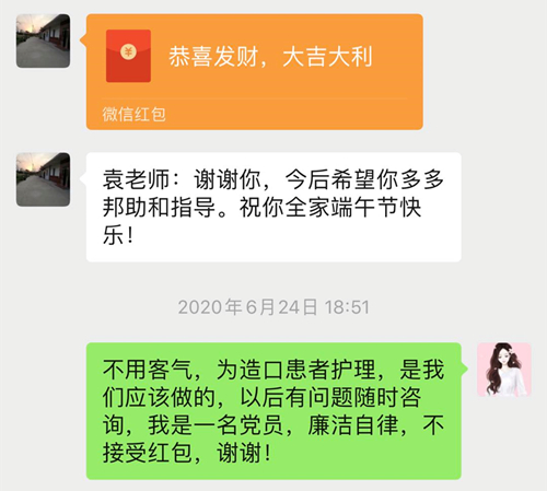 胃肠外科来了一位“微信达人”管爷爷,他是一位81岁高龄老人,因为喜欢玩微信,性格开朗,护士们便给他起了一个外号——“微信达人”管爷爷。管爷爷因直肠疾病接受过造口手术,术后造口出现反复渗漏问题,袁旭君便为其制定造口个性化护理方案,选用凸面底盘帮患者解决问题。患者出院后,袁旭君利用线上造口相关健康小讲座,对其开展了形式多样的延续性护理。患者非常感动,今年端午节当天,他想通过微信红包表达感谢之情,被袁旭君婉拒,她回答道:“谢谢您的认可!我是一名共产党员,廉洁自律,不接受红包!”