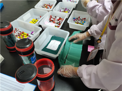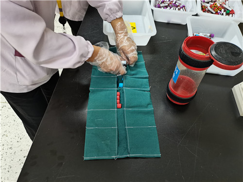 气动物流系统使用操作方便、高效。工作人员将标本装入传输瓶、输入目标站点代码,按一下按钮便能及时、方便、快捷地传输到指定目标站点。传输瓶自带芯片,可自动识别一键返回原科室。为有效固定标本试管确保传输安全,物业管理中心自行设计专用标本插袋,一次可最多传送标本达30支。由于医院血液标本化验点分散,通过调研沟通将“检验1”设为中间枢纽站,安排定点人员进行标本的分拣和二次传送,减轻了护理人员工作量。