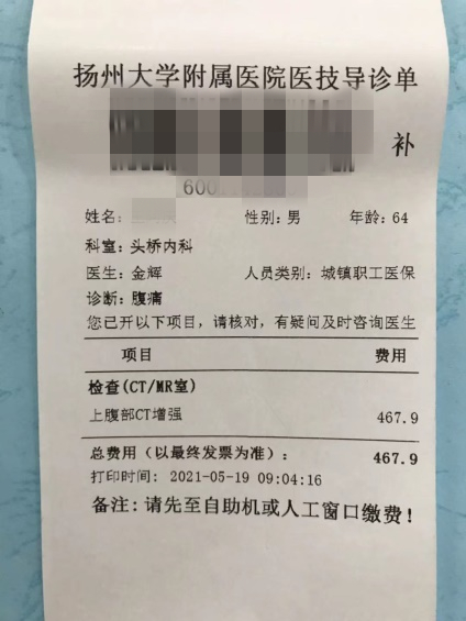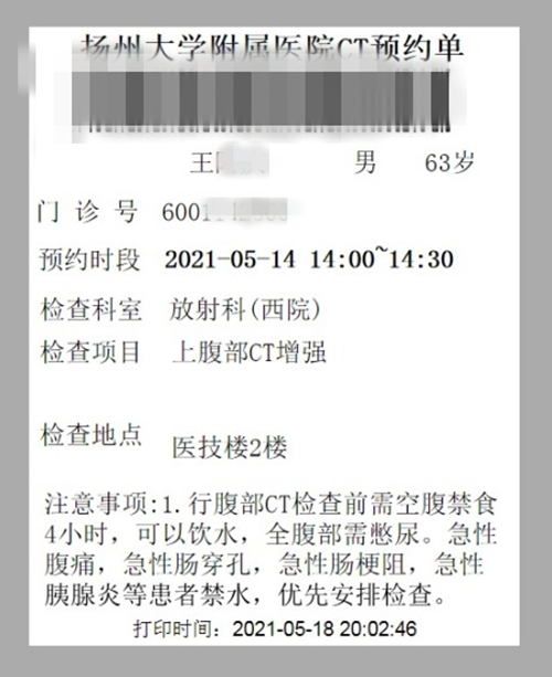 5月14日,头桥社区卫生服务中心的金医生给当地某患者开出了扬大附院的上腹部增强CT的申请单,患者在当地完成了缴费和检查预约。