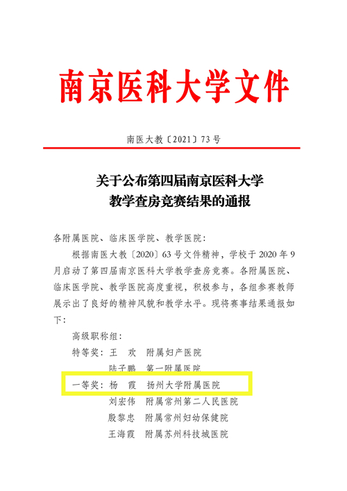 3月1日至6月30日,第四届南京医科大学教学查房竞赛决赛举行,此次竞赛共有来自南京医科大学45家教学单位的108位临床教师参加。经过选拔,我院妇产科副主任杨霞、消化内科主治医师王凝之代表我院教师参加了该比赛,最终杨霞获得高级职称组一等奖、王凝之获得中青年组三等奖的好成绩。