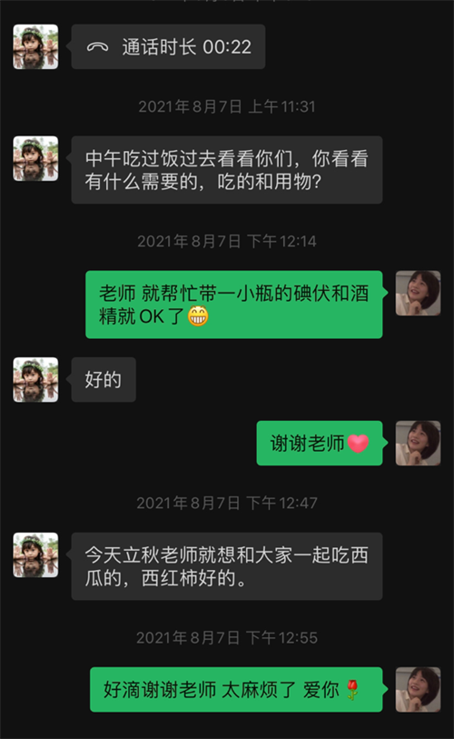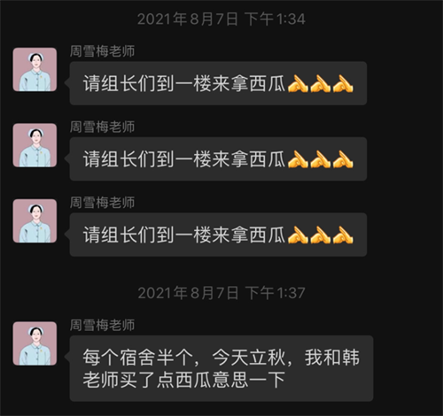 搬至淮海路校区后,我院教育处的工作人员和老师们都时时刻刻关心着同学们,每天都会发信息关注他们生活上有无困难、住宿方面需要解决的问题及提醒他们每天要做好防疫工作等。今年立秋当天,老师们惦记着他们,给同学们送去暖暖的爱。不光是老师,包括宿管阿姨、食堂阿姨、每天接送他们去医院取饭的司机师傅等也为他们做了很多。