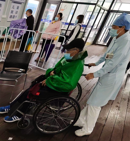 4月25日,雨水纷纷,81岁的李大爷穿着雨衣步履蹒跚地往流调登记台走着,顾长红和张翼两位护士看到后,立即上前询问:“大爷,您怎么了,哪里不舒服?”看李大爷喘得厉害,面色灰暗,张翼立即为他搬来椅子,并搀扶他坐下。?交流的过程中,大家发现李大爷听力有损,顾长红就一直半蹲着,凑在他耳边详细询问具体情况。经过长时间耐心的交流问询,终于弄清了李大爷来医院的目的。原来,李大爷是晕眩症发作,加之有多年心功能不全病史,儿女又都在外地,他便独自来我院就诊。老人无智能手机,流调员迅速手工帮他填写了预检分诊操作表,同时电话联系急诊科绿色通道工作人员,为李大爷申请开通绿色通道,并推着轮椅护送李大爷至急诊科就诊。