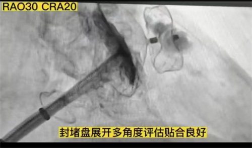 患者为一72岁老年女性,10余年来先后发生4次急性脑梗死,2019年更是遗留左侧肢体偏瘫,其生活质量受到严重影响,仅长期口服阿司匹林抗血小板治疗。此次,患者1个月内2次因房颤合并快速心室率、心衰,急诊入我院治疗。我院心血管内科主任李爱华查看后,分析患者心衰与房颤相关,且其多次脑卒中系阵发性房颤所致的心源性卒中。通过综合评估,结合家属意愿,在控制房颤症状、排查心房内血栓后,袁晓晨团队为患者实施房颤射频消融联合左心耳封堵“一站式”手术治疗。经过手术团队的密切配合,消融过程中,患者成功转复窦性心律。术中心内超声心动图(ICE)及左心耳造影提示患者左房血流瘀滞,左心耳为梳状肌发达的易发血栓的菜花型,在精确测量后,袁晓晨团队成功为患者植入一枚左心耳封堵器,手术顺利完成。术中及术后超声提示封堵器位置良好,无明显心包积液。