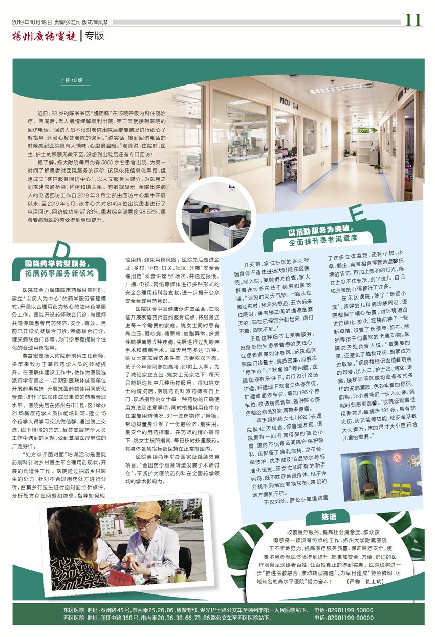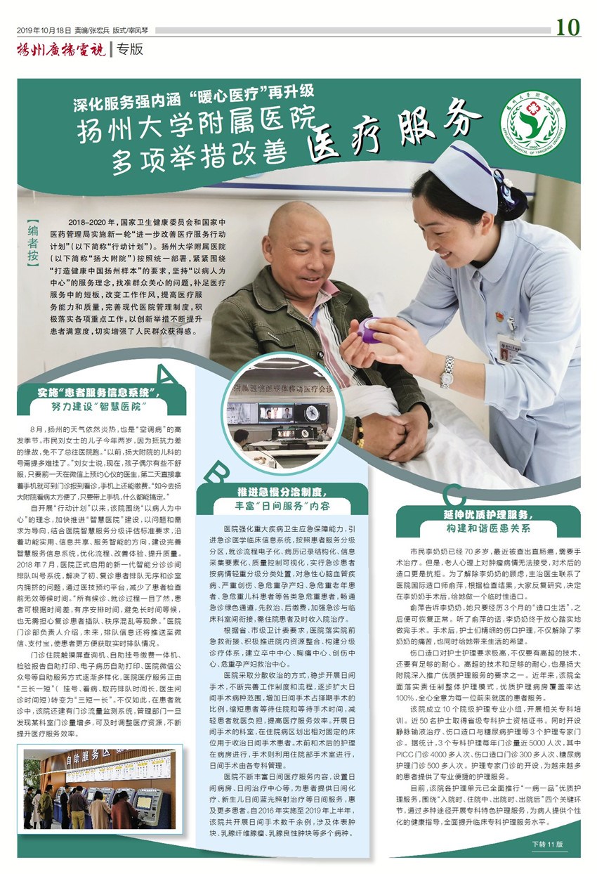 扬州大学附属医院紧紧围绕“打造健康中国扬州样本”的要求,坚持“以病人为中心”的服务理念,找准群众关心的问题,补足医疗服务中的短板,改变工作作风,提高医疗服务能力和质量,完善现代医院管理制度,积极落实各项重点工作,以创新举措不断提升患者满意度,切实增强了人民群众获得感。