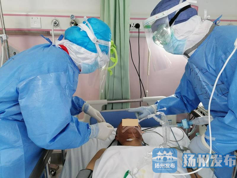 “由于我有ICU工作经验,所以根据统一安排,我协助医生一起给予患者床边气管插管。”扬州大学附属医院主管护师陈静介绍,一切准备就绪,陈庆丰、冷俊岭和麻醉科医师,开始为病人进行气管插管。虽然我们每个人身上都穿戴着厚厚的装备,但是很快我们医生就插管成功,减轻了患者的痛苦。
