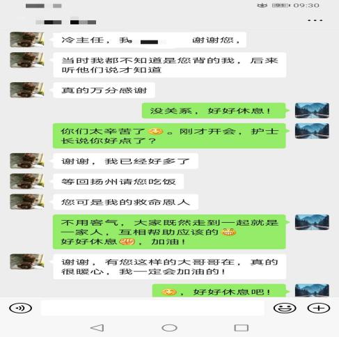 这是我们病区病情最重的一名患者的女儿与我的短信联系。因为患者的老伴、女儿都在其他医院隔离诊治,所以不能来这里探望,病情沟通也只能通过电话联系。得知她的父亲病重,她很担心,但也不能来床边尽孝,沟通插管时,电话里听得出她的低声抽泣。我与她短信联系,适时沟通她父亲的病情。她没有过多询问,只是表达着坚信和感谢!她说,“我相信你们医生是来救我们的,所以同意你们的任何医疗决策,对任何结果都有心理准备,不会有任何怪罪或者埋怨。第二,感谢你们医护人员所做的一切努力,请保护好自己,多与你们远方的亲人联系!”与她的沟通很短,但是很暖,我也不禁泪目,有这样的支持、理解,有这样的医患关系,我们医护会更有信心打赢这场没有硝烟的战争。