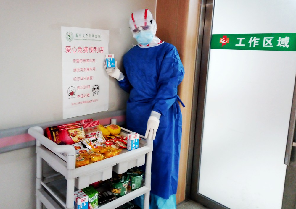交汇点讯 3月6日,扬州医疗队接管的武汉市第一医院重症病区内,一个免费物品便利店开业了。原来这是来自扬州大学附属医院的队员们为了方便患者,参照武汉当地为医护人员提供免费便利店的做法,将便利店搬进了隔离病区。