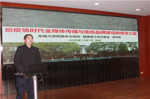 程守勤以“后疫情时代医院全媒体传播与品牌建设的嬗变之路”为题,结合疫情期间中大医院重症医学科邱海波教授的抗疫新闻宣传,从品牌建设和媒体传播的“势道术合”四个方面,与参会人员分享了医院新闻传播策略和实战经验。他表示,医院宣传不仅是文化软实力,也是“硬碰硬”的生产力。医院学科品牌的建设,需要全体员工增强宣传意识,整合和融合各方资源,运用全媒体进行广泛宣传,树立学科品牌文化。