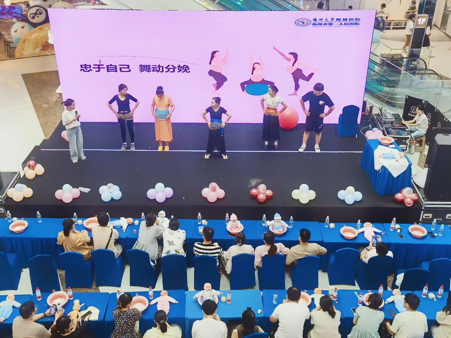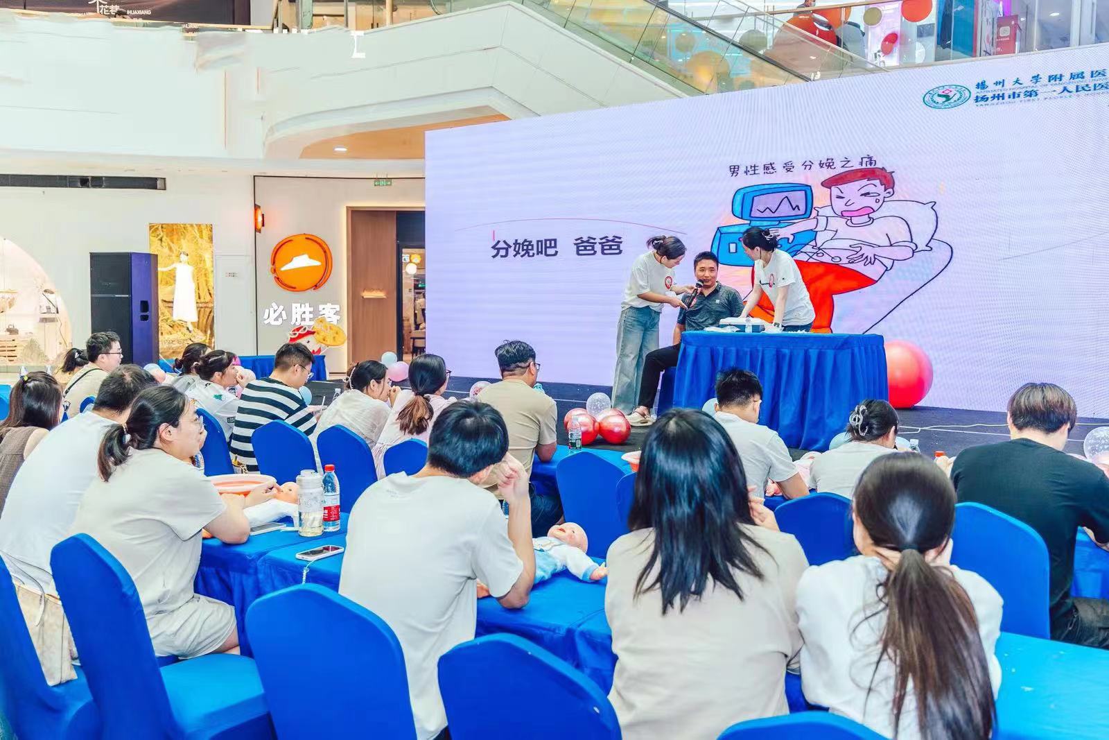 “舞动生命 快乐分娩”环节中,扬大附院产科母婴专科小组资深成员与爸爸妈妈们通过轻快的音乐、简单的舞蹈动作,在愉快的氛围中,帮助参与者学习到了分娩时的自由体位、骨盆摇摆、呼吸法与放松技巧等,学习到了宝贵的分娩知识。