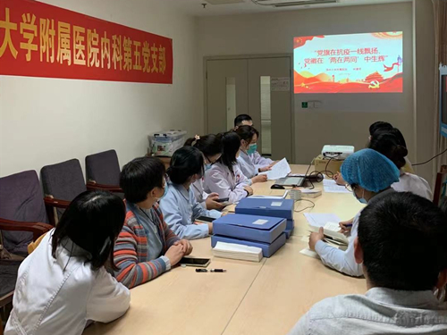 11月2日下午5:15,内科五支部在西23病区示教室召开第二次党员大会暨援市三院医疗队队员专题报告会。内科五支部全体党员、入党积极分子参加,内科五支部书记陈勇主持会议。陈勇在会上带领大家学习《在全院党员干部中开展“两在两同”建新功行动实施方案》的内容,他强调支部工作建设的重点任务体现在学习党史、悟思想、办实事、在开新局中建新功,在扎实做好疫情防控常态化工作中建新功,在持续加强医疗服务内涵建设中建新功,在高质量推进教学科研协同发展中建新功,在优化医院治理体系和治理能力中建新功以及在统筹做好发展保障各项工作中建新功6个方面。他表示,支部在接下来的工作中将通过深入调查研究和走访了解基层情况,全面排查梳理存在问题并列出清单,提出解决方案,力求做到“干一件成一件”,提升成效,真正把“为人民服务”的内涵落实到各项工作中去,始终同人民想在一起,干在一起,风雨同舟、同甘共苦,努力为党和人民争作出更大贡献。内科五支部组织委员林建琴作援市三院抗疫故事分享及《党旗在抗疫一线飘扬、党徽在“两在两同”中生辉》专题报告。她从党组织战斗堡垒筑一线、党旗飘扬在一线,党的声音传达在一线、党员先锋模范作用发挥在一线、党员志愿者奉献在一线4个方面讲述了在支援扬州市新冠肺炎定点收治医院期间,党员同志勇当先锋,率先垂范,把投身疫情防控一线作为初心使命,在隔离病房内将“敬佑生命、救死扶伤、甘于奉献、大爱无疆”的职业精神和职业