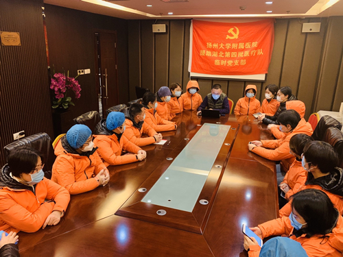 2月18日晚上8点,我院援助湖北第四批医疗队临时党支部第一次支部(扩大)会议在武汉驻地宾馆召开,我院第四批援湖北医疗队全体队员参加会议。会议由临时党支部书记冷俊岭同志主持。 会上,冷俊岭介绍了目前武汉市第一医院状况,扬州市医疗队主要接管感染科27、28病区。冷俊岭指出,我院医疗队全体队员要紧密围绕党支部的中心任务积极开展各项活动,党员和团员要发挥先锋队、生力军的作用,结合本次援鄂医疗任务的特点,充分发挥个人的主观能动性,克服严密防护带来的技术困扰,结合临床工作实际情况出点子、想办法,熟练掌握操作技能,提高工作效率,做好岗位上的多面手,提升医疗护理质量和患者的救治成功率,降低病死率,圆满完成此次抗疫工作。 会上成立第四批援鄂医疗队临时医疗管理组、物资管理组、护理工作管理组、宣传组、院感组等,积极开展抗击新型冠状病毒工作。蔡苗等14名同志向党组织提交入党申请书,积极盼望入党。