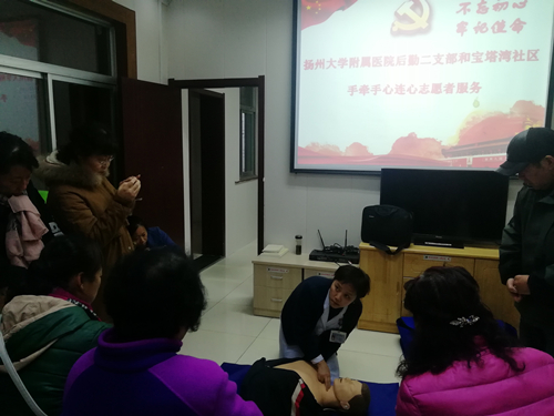 11月29日上午,后勤二支部组织部分党员、入党积极分子,来到文峰街道宝塔湾社区,开展“不忘初心、牢记使命”主题教育党日活动。 活动现场,党员同志们以实际行动服务群众,为社区居民提供了义诊服务,践行党的宗旨。赵烨同志为在场的居民和社区工作人员进行心肺复苏急救规范操作。在场居民纷纷表示,此教学效果非常好,通俗易懂,有些居民还踊跃上前亲自操作。义诊服务结束,大家来到社区口袋公园,清扫垃圾、铲除杂草。