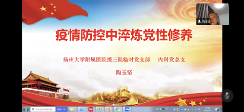 9月1日19:30,我院援三院重症医疗队临时党支部召开全体党员(扩大)会议暨党课学习活动,会议由临时党支部书记黄玉民主持,临时党支部副书记、支部委员、党员及预备党员30人参加。副院长龚院长列席会议。内科党总支书记陶玉坚给大家作题为“疫情防控中淬炼党性修养”党课。他首先从共产党员必须讲党性、重品行开始,以钱学森、邓稼先、钟南山、李兰娟等人物作为切入点,图文并茂地讲解了共产党人应当具备的素养;其次以张文宏、张定宇、李文亮等先进事迹深入阐释共产党员须具备敢作为、敢担当的精神;最后要求全体党员要弘扬共产党员守纪律、改作风的优良品格。随后,黄玉民开展线上民主生活会,党员同志开展批评与自我批评。呼吸与危重症医学科副主任医师欧阳小平、神经内科SICU副主任张帅、影像科主任王苇、呼吸与危重症医学科副主任陶玉坚、重症医学科护士长朱敏及产科护师王新宇依次发言。会上讨论推荐了入党积极分子。自8月5日以来,临时党支部共收到30位同志的入党申请。最后,黄玉民总结发言。他指出,医者仁心、精准施治的背后,是广大医护人员在医院党委的带领下,以实际行动践行初心,为保护人民生命健康安全筑起坚实的屏障。在下一阶段工作中,全体党员要不忘初心、牢记使命,一切为了人民,更加团结、守住底线、明确责任、狠抓落实,牢牢落实好防控责任、救治责任、院感责任,充分发挥党组织和党员先锋模范带头作用,为打赢这场防控阻击战做出应有的贡献。