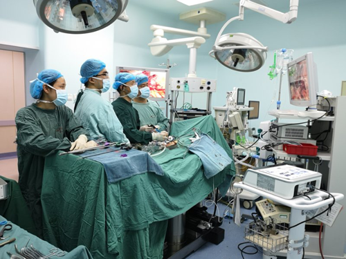 近日,东7病区肝胆外科主任医师戴勇团队成功为一胰腺巨大肿瘤女性患者实施完全腹腔镜下胰体尾+脾脏切除术,术后患者没有明显并发症,已康复出院。患者今年40岁,因“体检发现胰腺占位2天”入院。CT检查结果显示,患者的胰腺尾部有一8.8×7.6×9.2cm类圆形软组织肿块影,考虑为胰体尾部肿瘤、胰腺实性假乳头状瘤。在麻醉科、手术室等科室的全力配合下,戴勇团队运用微创腹腔镜技术,顺利地实施腹腔镜下胰体尾+脾脏切除术。切除的肿瘤经病理诊断确为胰腺实性假乳头状瘤。据了解,胰腺实性假乳头状瘤为胰腺罕见肿瘤,发病率约占胰腺肿瘤3%。运用腹腔镜微创手术具有切口小,患者术后疼痛轻微,下床活动早,恢复快等特点,已成为我院肝胆外科常规开展的腹腔镜微创手术。