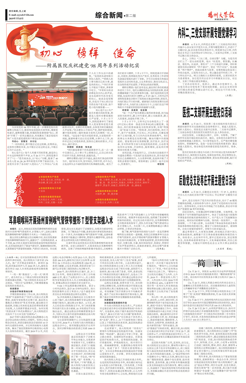 《扬州大学报•附属医院专刊》第19期(总第626期)(2019年7月15日第2版)
