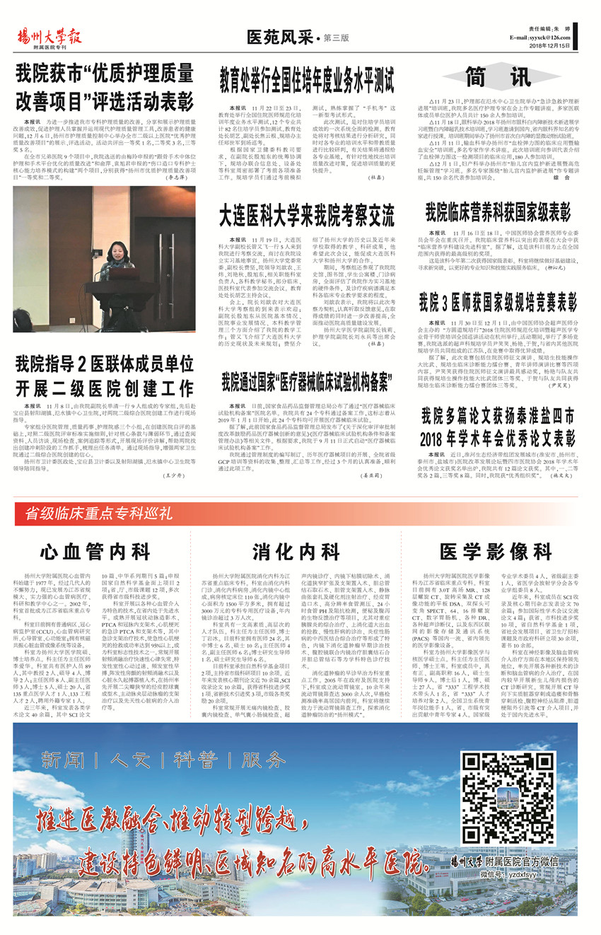 《扬州大学报•附属医院专刊》第12期(总第608期)(2018年12月15 日第3版)