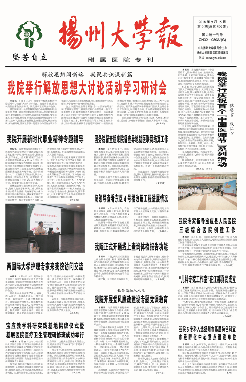 《扬州大学报•附属医院专刊》第9期(总第599期)(2018年9月15日第1版)