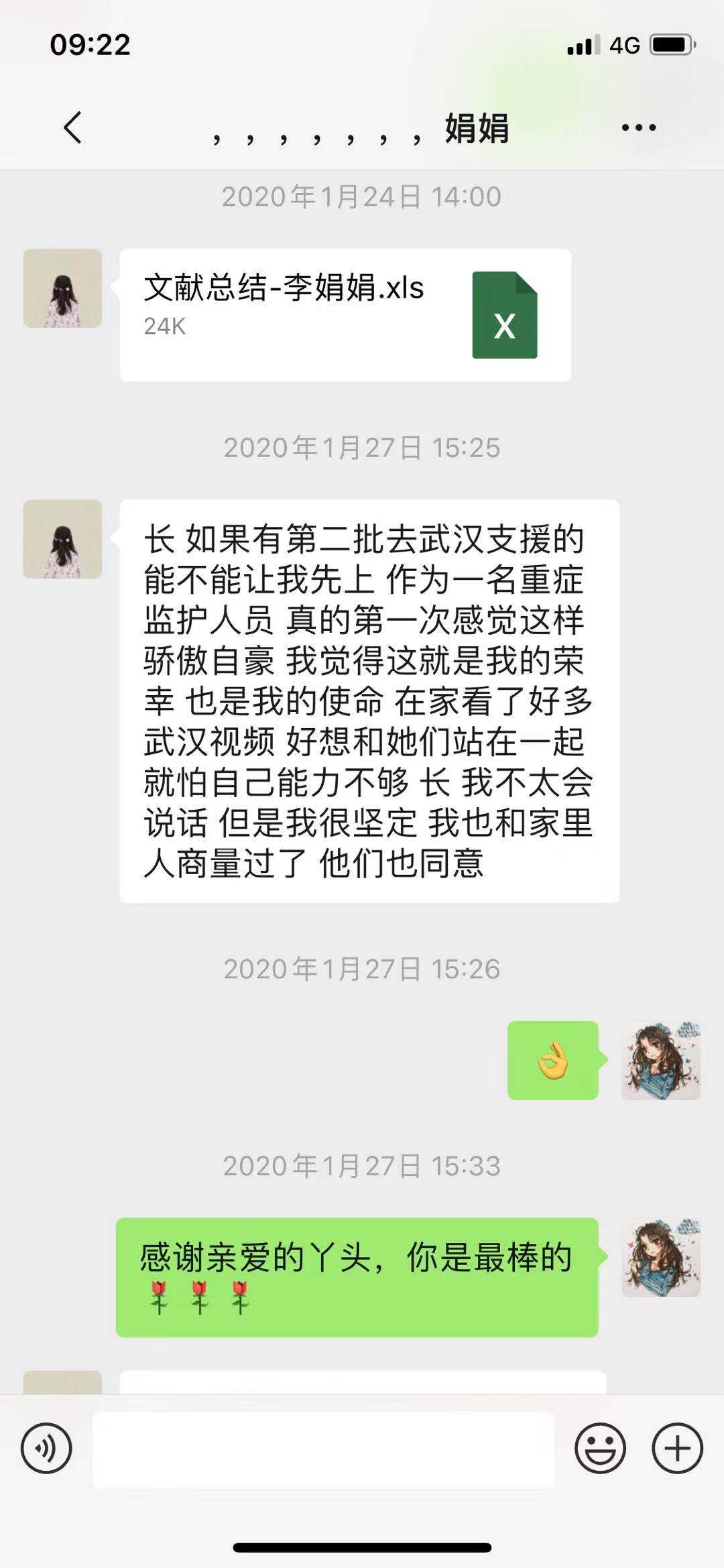 而美丽的90后护士李娟娟在这次自愿报名支援武汉时,给护士长发去了一条长长的微信。作为党员,李娟娟十分羡慕第一批支援武汉的两名同科室姐妹,她在给组织的“请战书”中说,自己不太会说话,但很坚定,“能不能让我先上?在家看了好多武汉视频,好想和她们站在一起”。