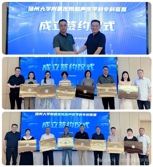 会议期间举行扬州大学附属医院超声医学科专科联盟成立及授牌仪式。王苇,我院相关职能部门负责同志,高邮市人民医院等首批10家扬州市二、三级医疗机构以及广陵区东关街道社区卫生服务中心等14家扬州市基层医疗机构代表参加活动。